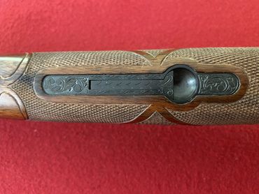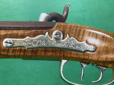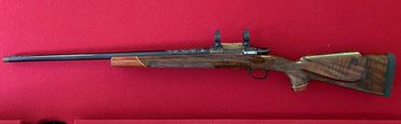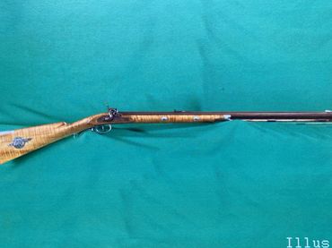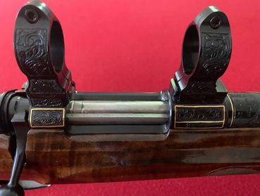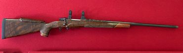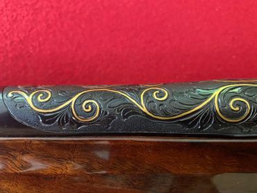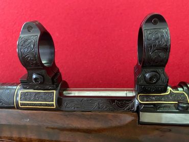 Cal .22 Remington. AAA Fancy Claro Walnut rollover cheekpiece, 24" Douglass Premium barrel, 24K gold line work with scroll pattern on barrel, rings, action. 24k gold fox inlay. Stock checkering by Jason Basham- 2021