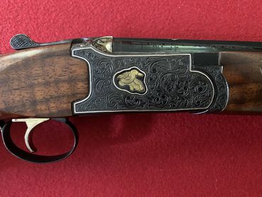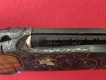Over-Under .410. Stocked in Bastogne Walnut, Fine silver linework and engraved scroll pattern. Stock checkered by Jason Basham-2020
